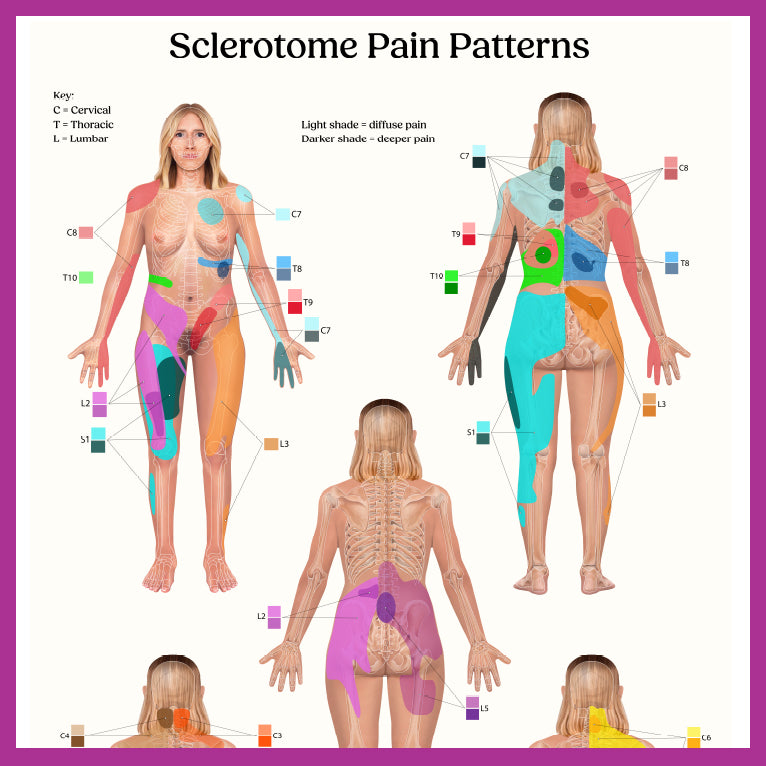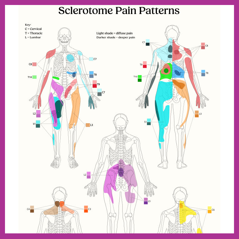 Buy Sclerotome Pain PosterEnhance your understanding of human anatomy with our Sclerotome Pain Patterns Anatomy Poster. This eye-catching Physiotherapist to Chiropractor, educational wall art is perfect for healthcare professionals, chiropractors, massage therapists, doctors, osteopaths, rheumatologists, sports medicine, students, or anyone interested in human anatomy and pain management.