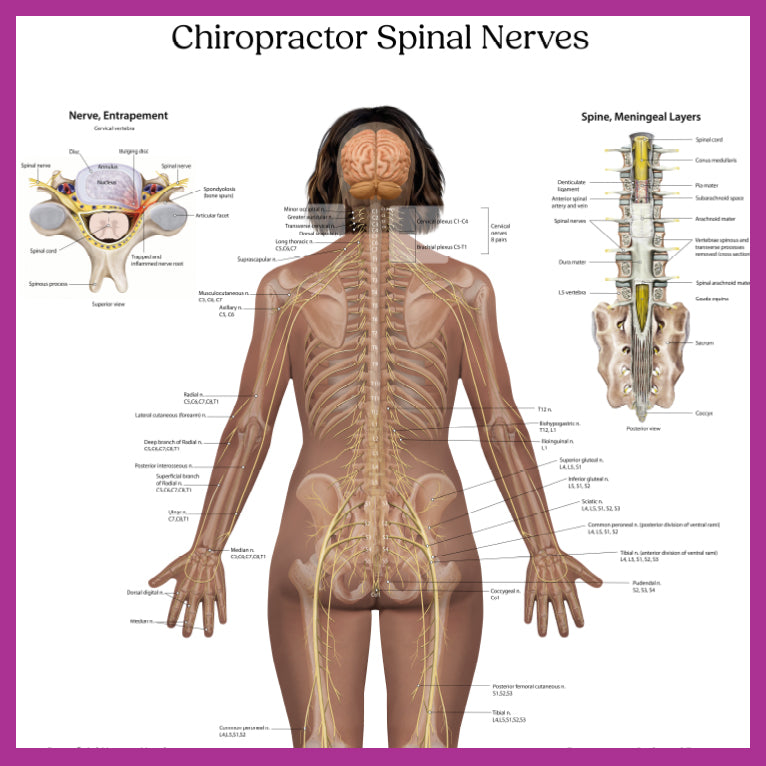 Buy Chiropractor Spinal Nerves PosterThis patient friendly poster is a welcome addition to any Chiropractors clinic describing the anatomy of the spinal nerves. Chiropractors address spinal nerves by using manipulation to correct misalignment. Techniques include targeted manual adjustments, soft tissue therapy, and exercise, often resulting in increased mobility, decreased inflammation, and improved nerve function.